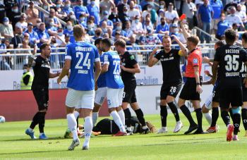 19.09.2021 Darmstadt. Merck-Stadion am Böllenfalltor 2.Bundesliga, Saison 2020/2021 SV Darmstadt 98 gegen SG Dynamo Dresden Aufgrund eines Fouls an Yannick STark (Dresden) erhält Fabian Schnellhardt (8, SVD) von Schiedsrichter Christian Dingert die Rote Karte ********* Foto: Peter Hartenfelser