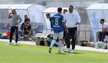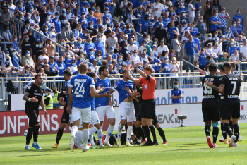 19.09.2021 Darmstadt. Merck-Stadion am Böllenfalltor 2.Bundesliga, Saison 2020/2021 SV Darmstadt 98 gegen SG Dynamo Dresden Nach der roten Karte nimmt Torwarttrainer Dimo Wache den Rotsünder Fabian Schnellhardt (8, SVD) in Empfang ********* Foto: Peter Hartenfelser