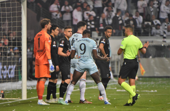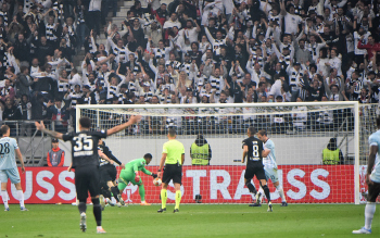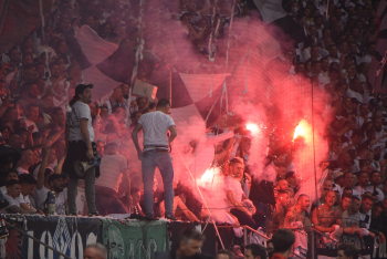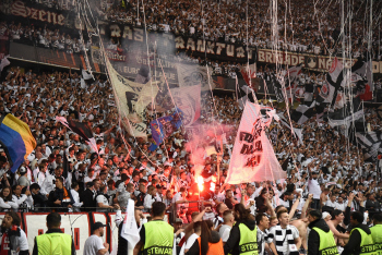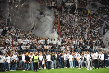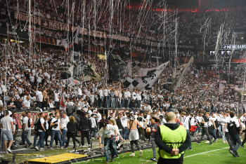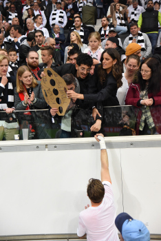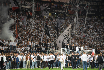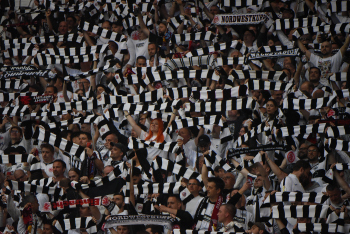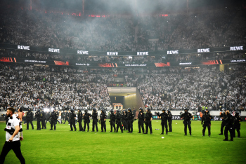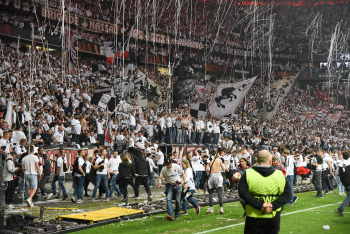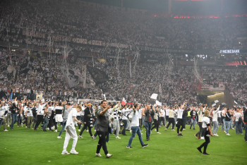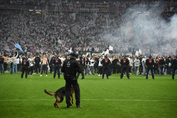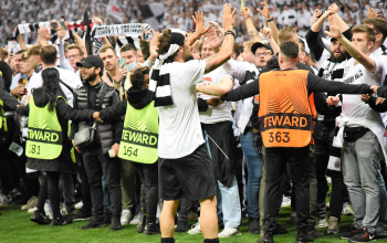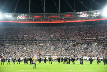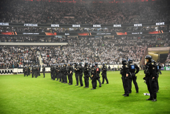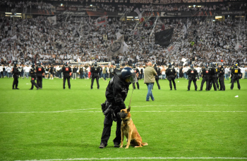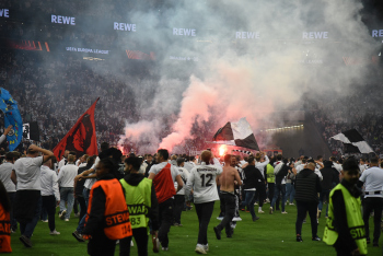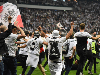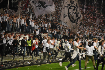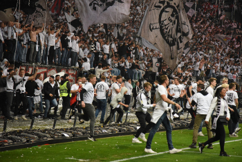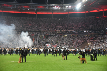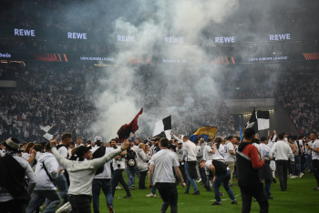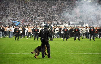 Nach dem Eintracht Sieg und den Einzug ins Finale stürmen die Fans / Ultras auf den Platz, die Polizeikette soll verhindern, das die Fangruppen aufeinander treffen