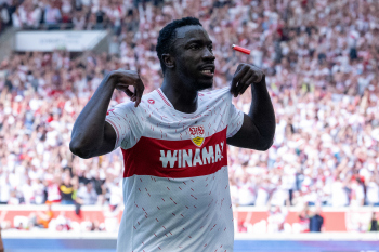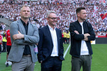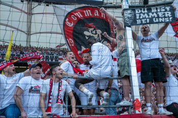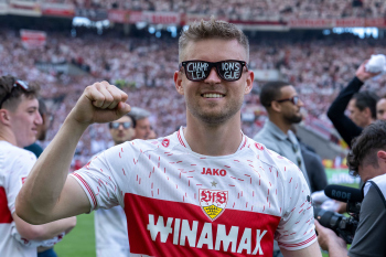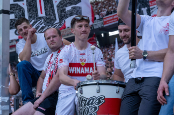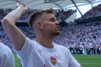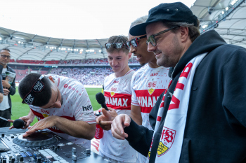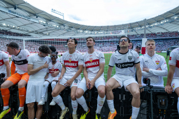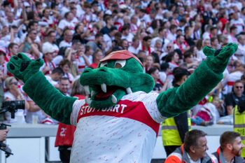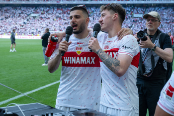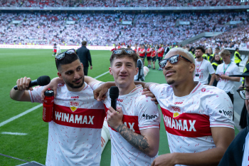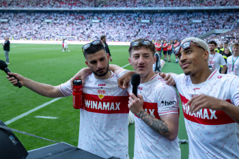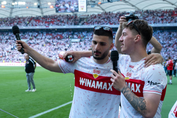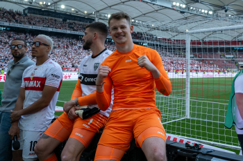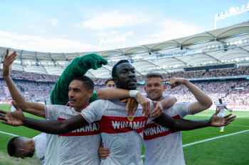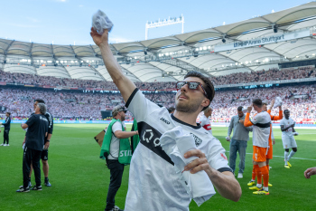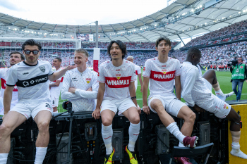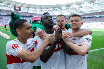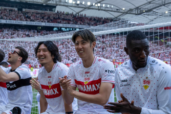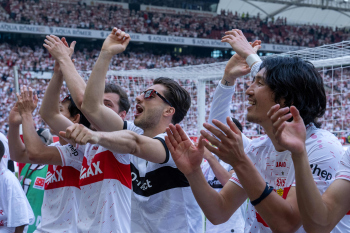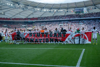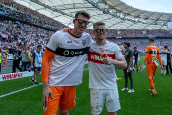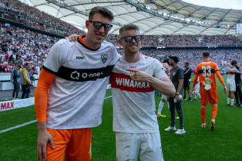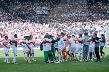 Jubel und Freude nach dem Schlusspfiff bei den Stuttgarter Spielern, v.l. Wooyeong Jeong, Silas Katompa Mvumpa, Enzo Millot, Genki Haraguchi, Maskottchen Fritzle, Chris Führich, Torwart Florian Schock, Jamie Leweling, Pascal Stenzel und Anthony Rouault (VfB Stuttgart).