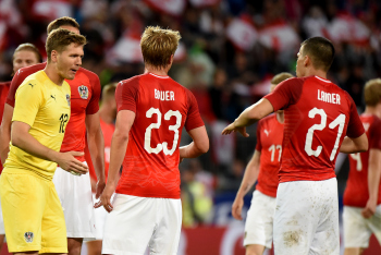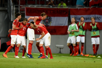 Jubel und Freude bei Florian Grillitsch (AUT), Stefan Lainer (AUT), Sebastian Prödl (AUT), Torschütze Alessandro Schöpf (AUT).