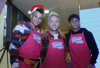 06.12.2023 Frankfurt am Main, Römerhalle Bernd-Reisig-Stiftung „helfen helfen“ Zum 11. mal Weihnachtsgans-Essen für Obdachloe und hilfsbedürftige Menschen Bild zeigt links Prince Damien (Sänger, Tänzer), rechts Tyler Woods Sohn von Rados Bokel ********* Foto: Peter Hartenfelser