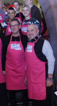 06.12.2023 Frankfurt am Main, Römerhalle Bernd-Reisig-Stiftung „helfen helfen“ Zum 11. mal Weihnachtsgans-Essen für Obdachloe und hilfsbedürftige Menschen Bild zeigt Gastgeber Bernd Reisig mit seinen prominenten Helfern ********* Foto: Peter Hartenfelser