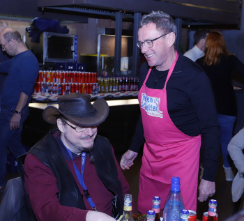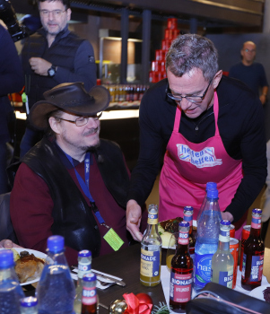 06.12.2023 Frankfurt am Main, Römerhalle Bernd-Reisig-Stiftung „helfen helfen“ Zum 11. mal Weihnachtsgans-Essen für Obdachloe und hilfsbedürftige Menschen Bild zeigt Österreichs Nationaltrainer Ralf Rangnick mit Festwirt Eddy Hausmann ********* Foto: Peter Hartenfelser
