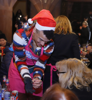 06.12.2023 Frankfurt am Main, Römerhalle Bernd-Reisig-Stiftung „helfen helfen“ Zum 11. mal Weihnachtsgans-Essen für Obdachloe und hilfsbedürftige Menschen Bild zeigt perfektr Kellner Frankfurts OP Mike Josef ********* Foto: Peter Hartenfelser