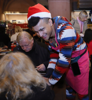 06.12.2023 Frankfurt am Main, Römerhalle Bernd-Reisig-Stiftung „helfen helfen“ Zum 11. mal Weihnachtsgans-Essen für Obdachloe und hilfsbedürftige Menschen Bild zeigt Frankfurter Travestiekünstler Thomas Rau (Olga Orange) ********* Foto: Peter Hartenfelser