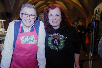06.12.2023 Frankfurt am Main, Römerhalle Bernd-Reisig-Stiftung „helfen helfen“ Zum 11. mal Weihnachtsgans-Essen für Obdachloe und hilfsbedürftige Menschen Bild zeigt Travestie -Star Olga Orange mit Sägerin und Tischkicker-Weltmeisterin Maura Porrmann ********* Foto: Peter Hartenfelser