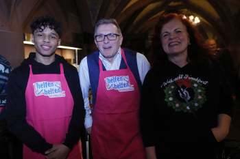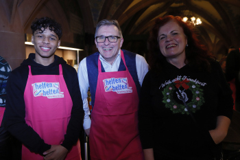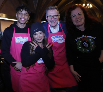 06.12.2023 Frankfurt am Main, Römerhalle Bernd-Reisig-Stiftung „helfen helfen“ Zum 11. mal Weihnachtsgans-Essen für Obdachloe und hilfsbedürftige Menschen Bild zeigt: Tyler Wood (Sohn von Rados Boke) Bürgermeister Steffen Ball (Heusenstamm) mit seiner Frau Madeleine Ball Geschäftsführerin Ballcom Digital Public Relations ********* Foto: Peter Hartenfelser
