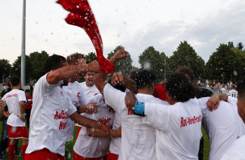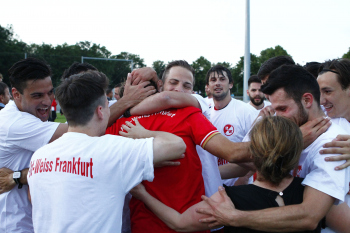 110615_11062015 Fussball regional - Saison 2014 / 15 - Relegation Rotweiss Frankfurt - Kelsterbach / Jubel bei der Mannschaft Rot weiss ist in die Hessenliga aufgestiegen mi Trainer Niko Arnautis ********* Foto: Hartenfelser