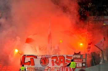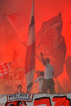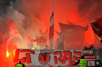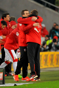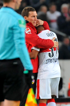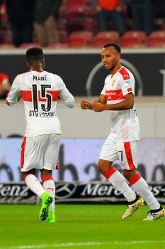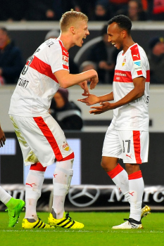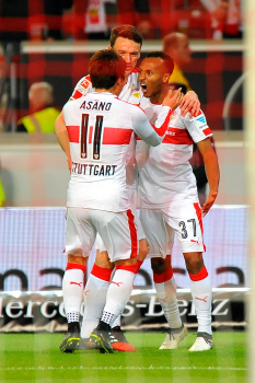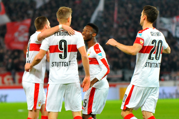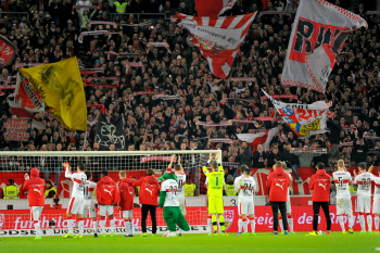 Marvin Kaminski (VfB Stuttgart), Takuma Aasano (VfB Stuttgart), Maskottchen Fritzle (VfB Stuttgart), Christian Gentner (VfB Stuttgart), Torwart Mitchell Langerak (VfB Stuttgart), Josip Brekalo (VfB Stuttgart), Timo Baumgartl (VfB Stuttgart), Daniel Ginczek (VfB Stuttgart) feiern mit Ihren Fans.