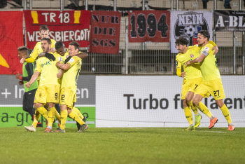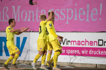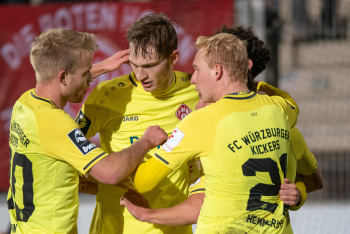 Torjubel des Torschützen Dominic Baumann (FC Wuerzburger Kickers), Jubel und Freude bei Maximilian Breunig, Leroy Kwadwo, Patrick Sontheimer, Fabio Kaufmann und Sebastian Schuppan (FC Wuerzburger Kickers).