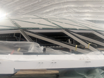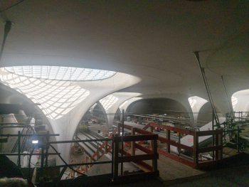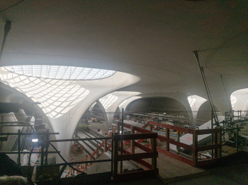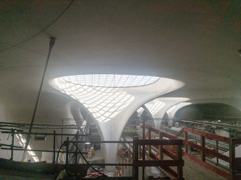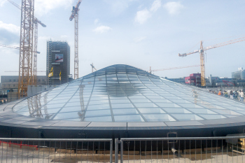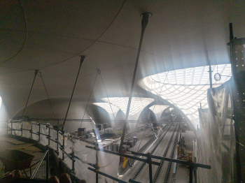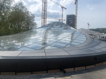 Blick auf die Gitterschale, hier die koppelartige Tragkonstruktion des Zugangsbauwerk Staatsgalerie.