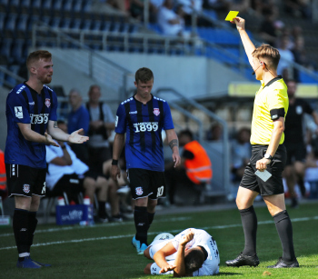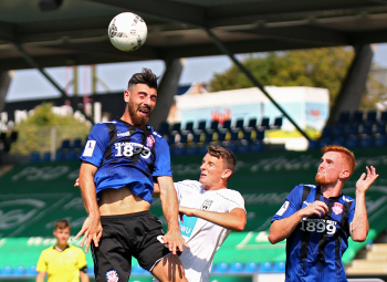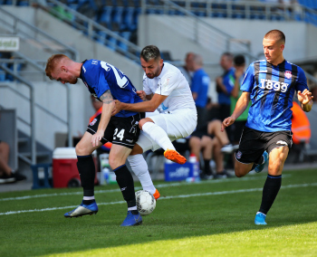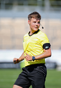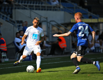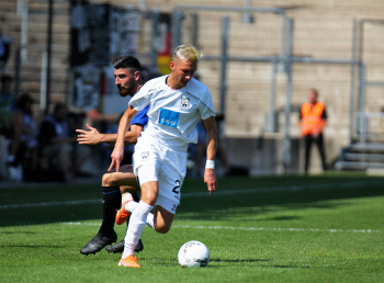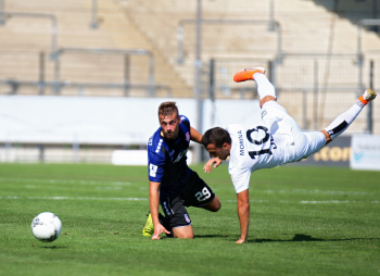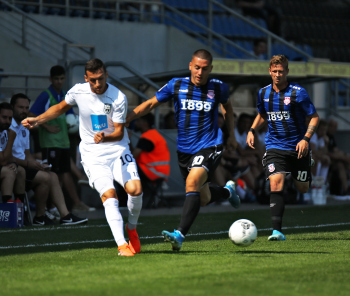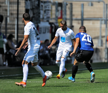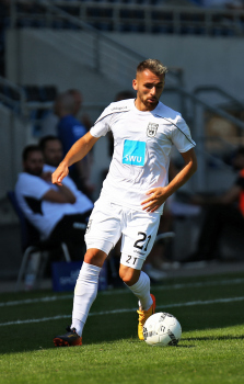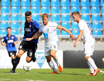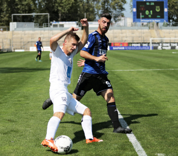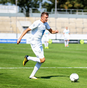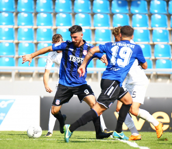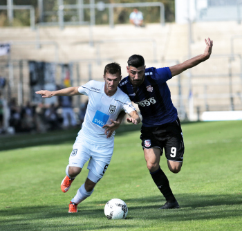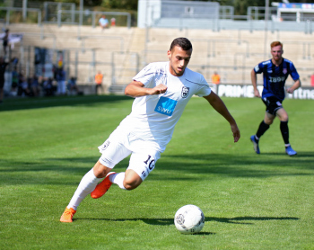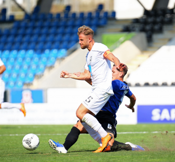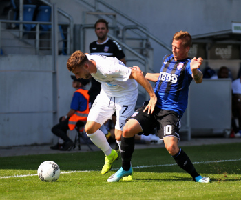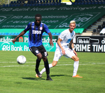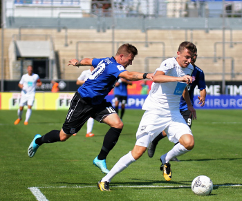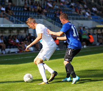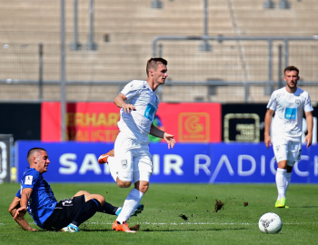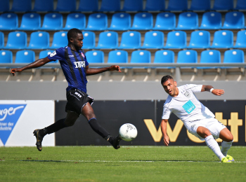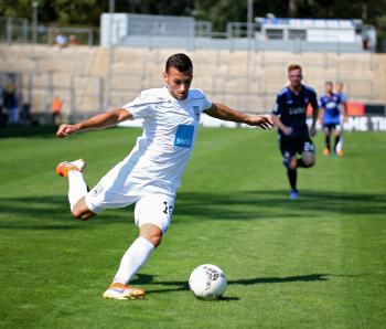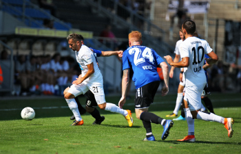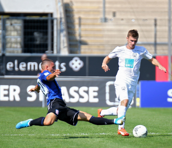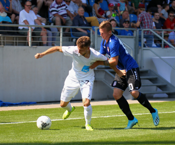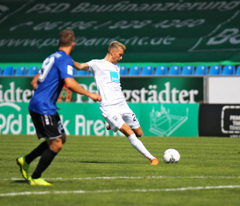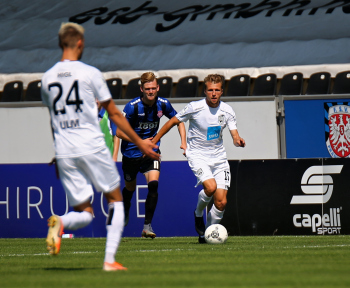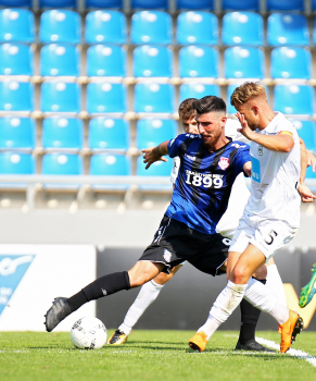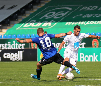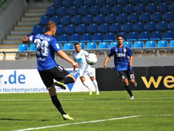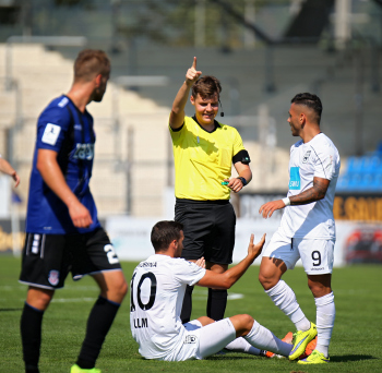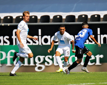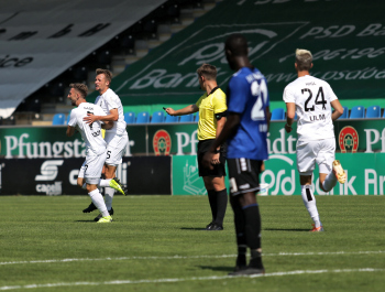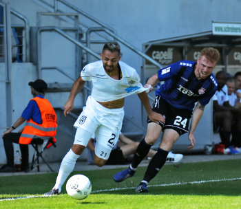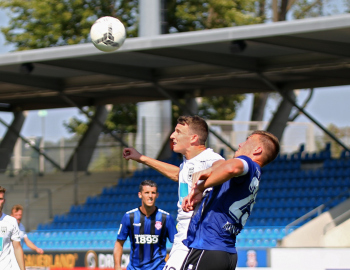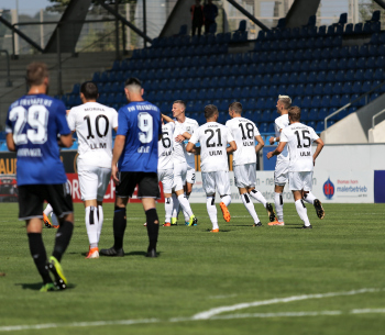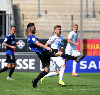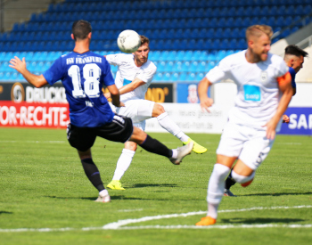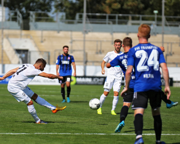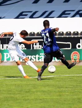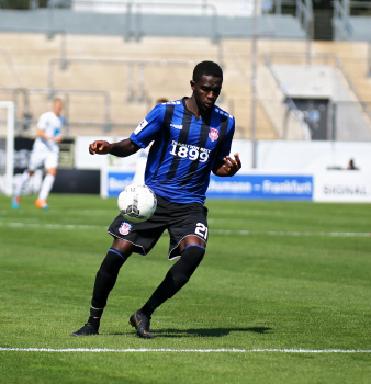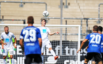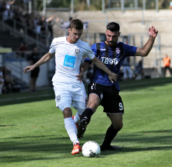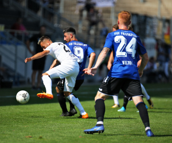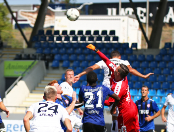 31.08.2019, xxx, Frankfurt, PSD Arena, Fussball, Regionalliga Suedwest, Saison 2019/2020, FSV Frankfurt gegen SV Ulm 1948; Faustabwehr Marco Aulbach Torwart (FSV Frankfurt), vor Ardian Morina (SSV Ulm 1846); und dahinter Nestor Djengoue (FSV Frankfurt),