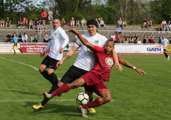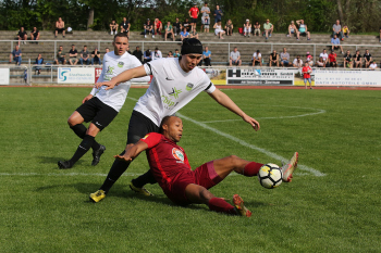 Aljoscha Atzberger (10, Spvgg 03 Neu-Isenburg) und Patrick Albert (7, Spvgg. 03 Neu-Isenburg) gegen Manuel Profumo (Pars)