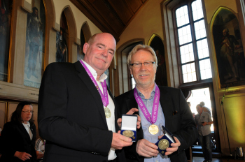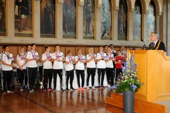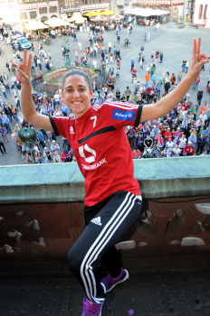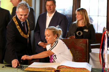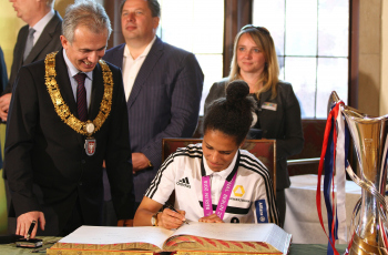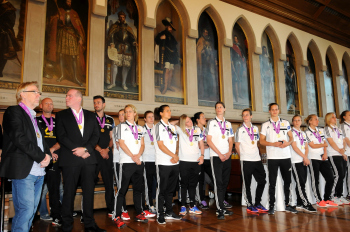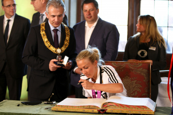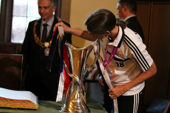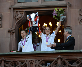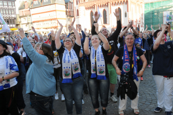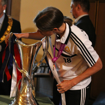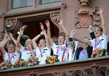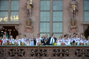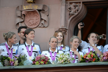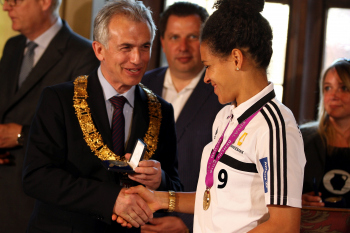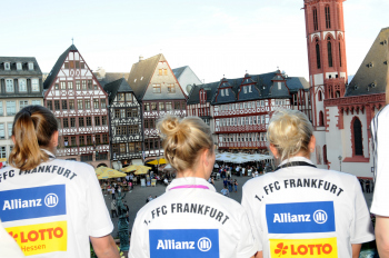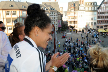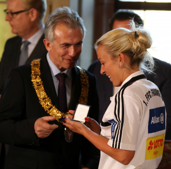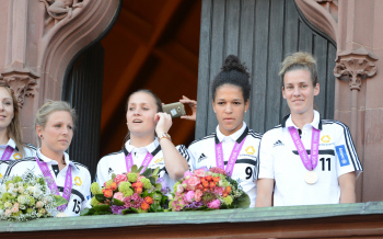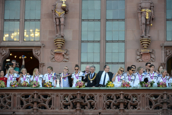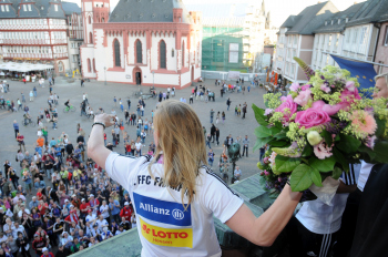 Schmidt, Bianca und Schumann, Desir?e ( FFC Frankfurt) mit dem Pokal, dabeiMinister Peter Beuth und OB Peter Feldmann
