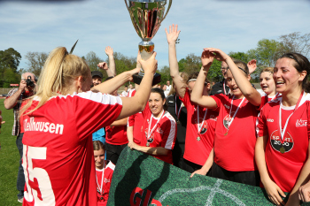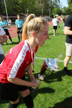 22.4.2019 Neu-Isenburg, Sportpark Frauen Kreispokalfinale FC Neu-Isenburg - FSG Rodgau/Zellhausen - Pokal-Sieger nach Elfmeterschießen Maren Bambach (FC Neu-Isenburg) *** Foto:Peter Hartenfelser ****** Foto: Peter Hartenfelser