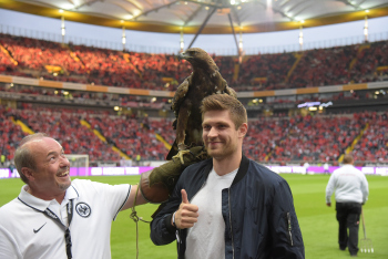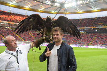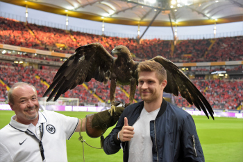 Falkner Norbert Lawitschka mit Eintracht Maskottchen Adler Attila und NHL Eishockyspieler Leon Draisaitl (Edmonton Oilers)