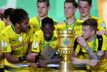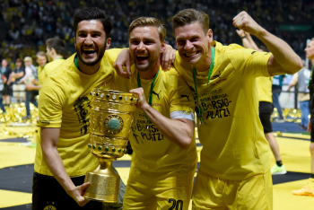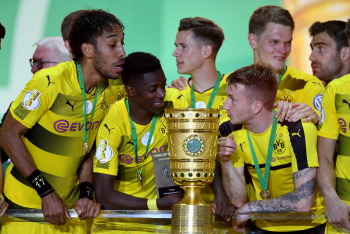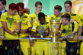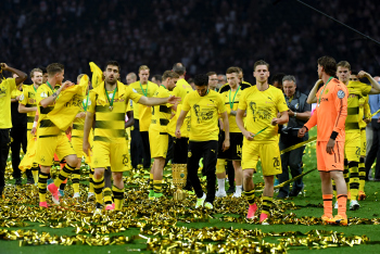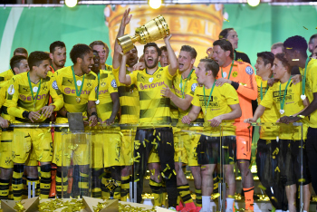 Jubel und Freude bei Pierre-Emerick Aubameyang (Borussia Dortmund), Ousmane Dembele (Borussia Dortmund), Marcel Schmelzer (Borussia Dortmund), Marco Reus (Borussia Dortmund), Torwart Roman Weidenfeller (Borussia Dortmund), Matthias Ginter (Borussia Dortmund), Marc Bartra (Borussia Dortmund), Shinji Kagawa (Borussia Dortmund), Torwart Roman Bürki (Borussia Dortmund).