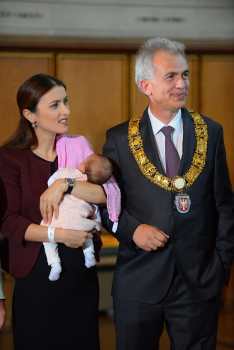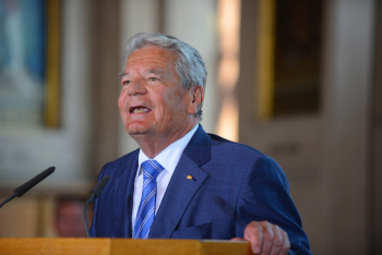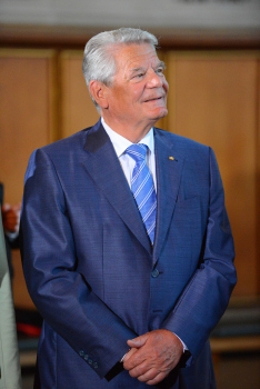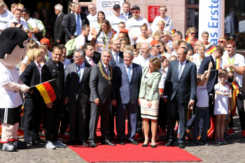 Innenminister Thomas de Maizi?re, Stadtrat Markus Frank, Bundespr?sident Joachim Gauck mit Lebensgef?hrtin Daniela Schadt, DOSB-Boss Alfons H?rmann, begr?ssen die Olympiateilnehmer