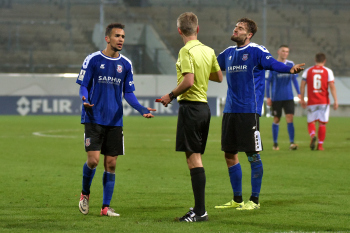 Azaouagh, Ahmed (7, FSV Frankfurt) und Robert Schick (15, FSV Frankfurt) diskutieren mit Schiedsrichter Luca Schlosser nach der Gelb Rote Karte