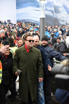 25.01.2020 Kitzbühel 80. Hahnenkamm Rennen 2020 - Ski Alpin Abfahrt Herren Streif Arnold Alois Schwarzenegger kommt mit seinen Baodyguards : *** Foto Peter Hartenfelser ********* Foto: Peter Hartenfelser
