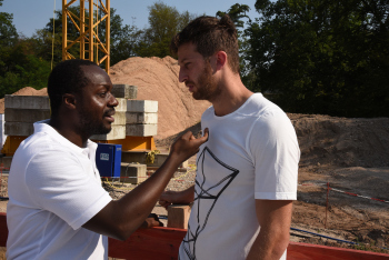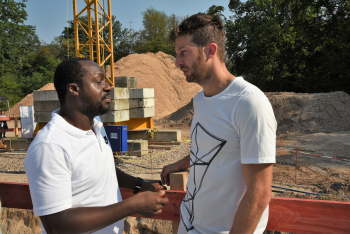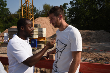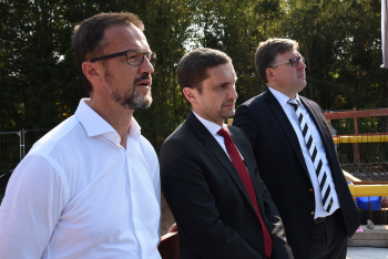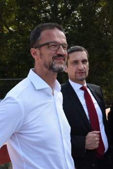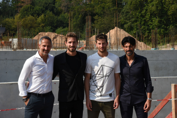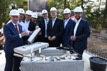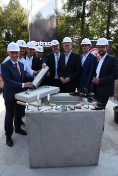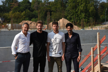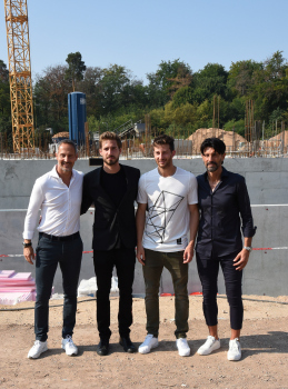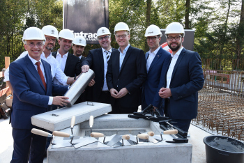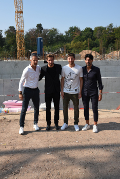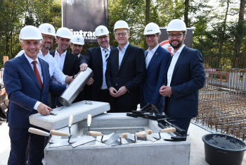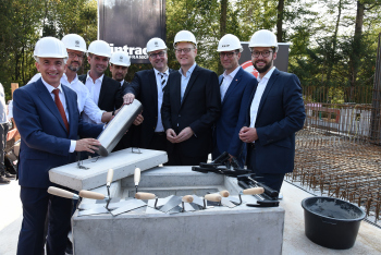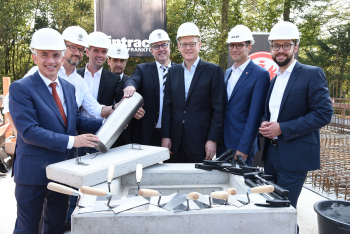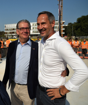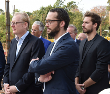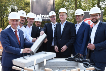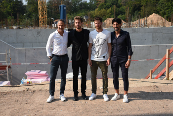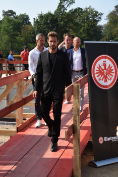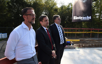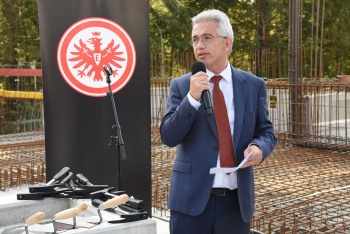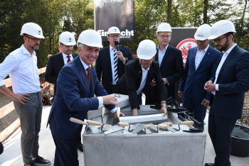 Frankfurts Oberbürgermeister Peter Feldmann, Vorstand Fredi Bobic, Vertreter Baugesellschaft, Vorstand Oliver Frankenbach, Vorstand Axel Hellmen, Frankfurts Stadtrat Markus Frank, Verteter AS+P, Frankfurts Stadtrat Jan Schneider