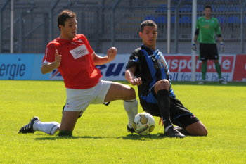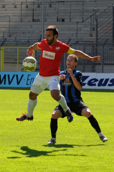 28.08.2010, 6.Spieltag Oberliga Baden-Wuerttemberg 2010/2011, SV Waldhof Mannheim 07 (blau/schwarz) vs. VfB Neckarrems (rot), Luigi Ancona (links), Marco Laping (mitte), Fisnik Myftari (vorne), Fitim Fazlija (hinten)