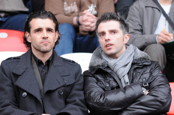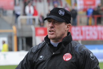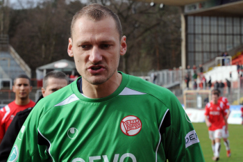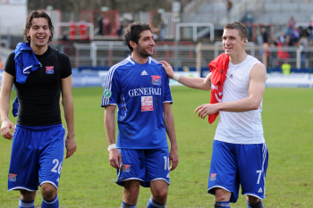 27.03.2010, 3. Liga, 30. Spieltag: Kickers Offenbach:SpVgg Unterhaching, Freude ?ber den Sieg Christian Hain, Torsch?tzen Leandro Grech, Thomas Schweinsteiger (Unterhaching)