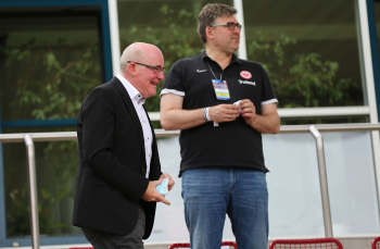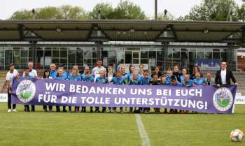 Gruppenfoto, Gruppenbild, Mannschaftsbild nach dem Spiel, letztes Spiel vor Uebernahme durch Eintracht Frankfurt, Danke, Banner