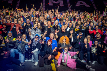 Bild zeigt Genießen das Bad in der Musikermenge Tobias Kämmerer (Lederjacke, schwarzes T-Shirt), Patrik Meyer, Macher (Blaues T-Shirt, Kopfhörer, Brille, hockend) und Musikalischer Direktor Mark Smith (Brille, schwarze Grand Jam T-Shirt, Kinnbart, Arme zur seit gestreckt)