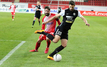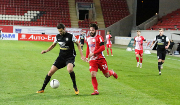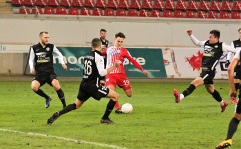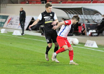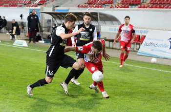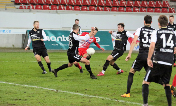 Mathias Fetsch (25, OFC) und SEBASTIAN ZIELENIECKI (5, OFC) gegen Kevin Conrad (Elversberg)