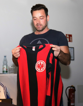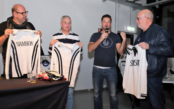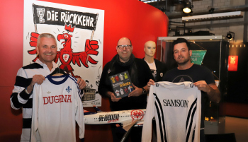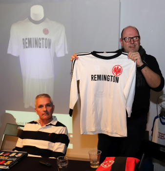 Bild zeigt: , Autor Stefan Appenowitz, Andreas Brandes Co-Autor, Trikotsammler Boris Möller mit einem Trikot von Bernd Nickel