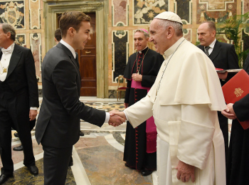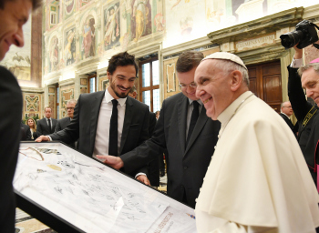 Thomas MUELLER (Deutschland), Mats HUMMELS (DFB/Deutschland) und Reinhard Grindel (DFB-Praesident) ueberreichen dem Papst ein Trikot.
