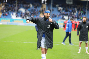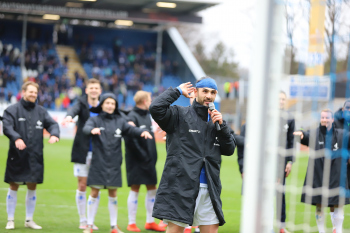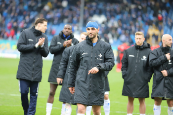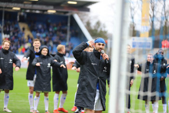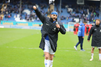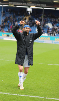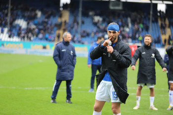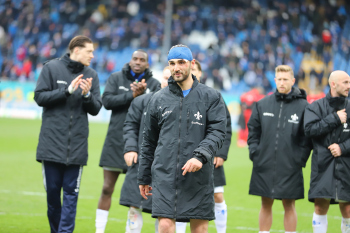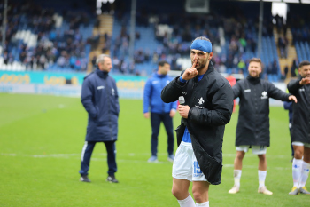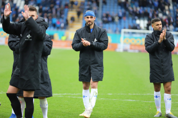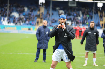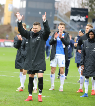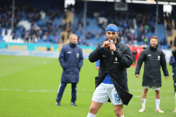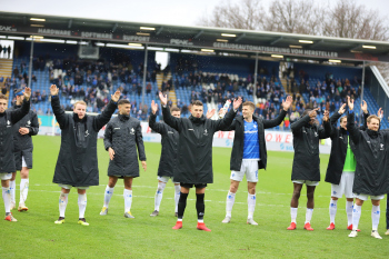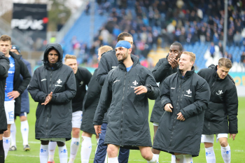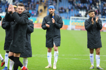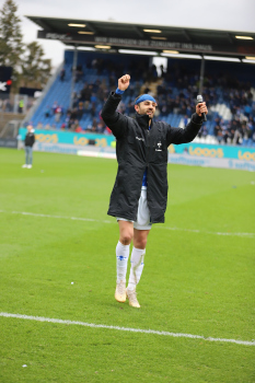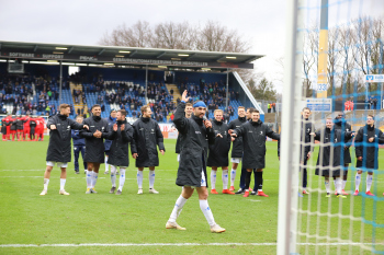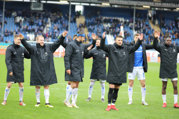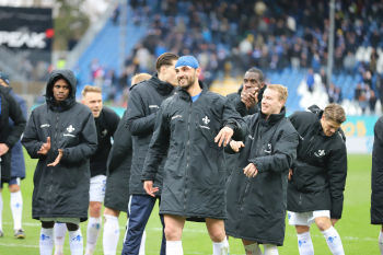 Schlussjubel nach dem Sieg feiert die Mannschaft von Darmstadt vor der Fantribüne