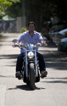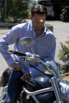 04.02.2007, w w w . k e i n - p l a t z - f u e r - r a s s i s m u s . d e , Uwe Bindewald probiert eine Harley-Davidson aus