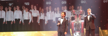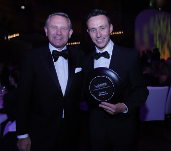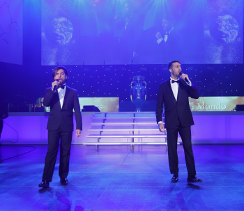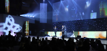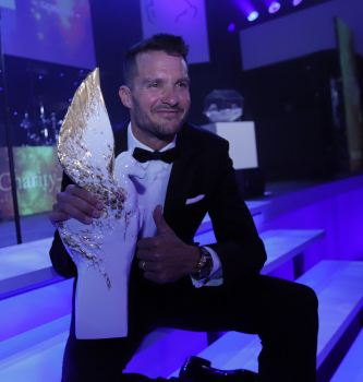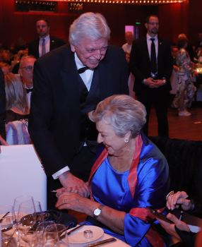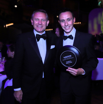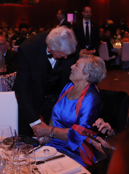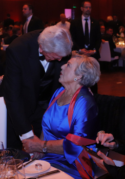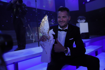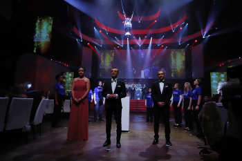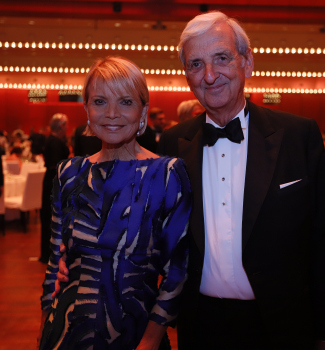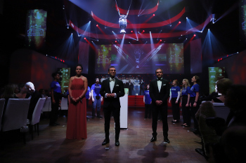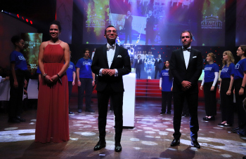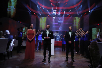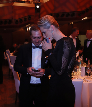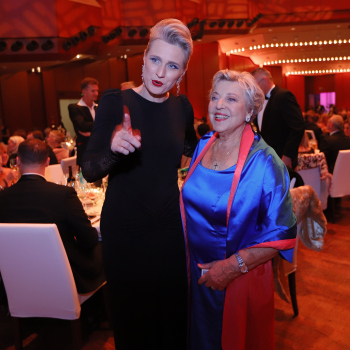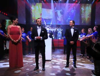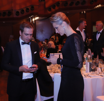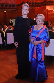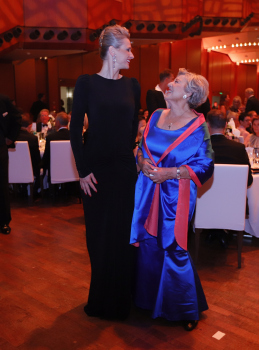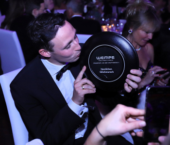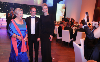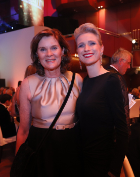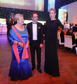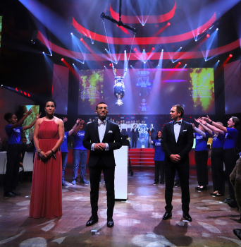 zu den Klängen von "You raise me up" erhebt sich der Pokal in die Mitte des Raums begleitet von Célia Šašić, Vizepräsidentin des DFB, Frankfurts OB Mike Josef,