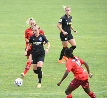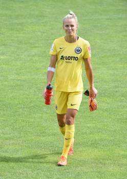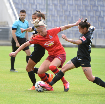 Reuteler, Géraldine (14, Eintracht Frankfurt) und Laura Freigang (10, Eintracht Frankfurt) gegen Sharon Beck (Eintracht Frankfurt)