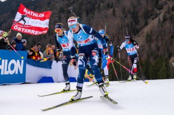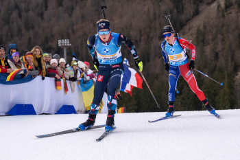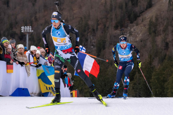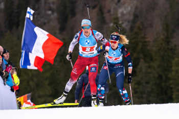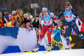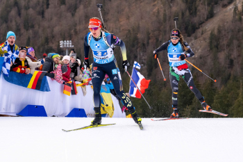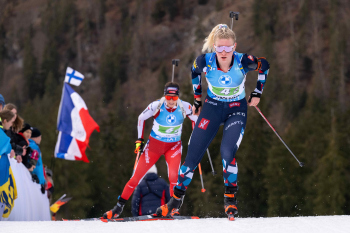 Germany - JANUARY 14: Dunja Zdouc (AUT) und Karoline Offigstad Knotten (NOR) at the Biathlon, IBU World Cup: Ruhpolding, Women 4x6km Realy, at the Chiemgau Arena on January 14, 2023 in Ruhpolding, Germany.