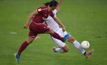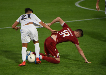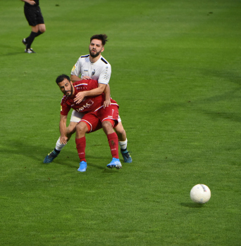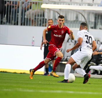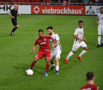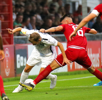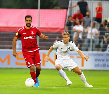 09.08.2019, xxx, Dreieich, Fussball, Hahn Air Sportpark; Lotto Hessenliga, Saison 2019/2020, SC Hessen Dreieich gegen 1. Hanauer FC; in rot Varol Akgoez (SC Hessen Dreieich); gegen Tim Franz (FC Hanau 93);