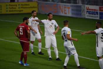 09.08.2019, xxx, Dreieich, Fussball, Hahn Air Sportpark; Lotto Hessenliga, Saison 2019/2020, SC Hessen Dreieich gegen 1. Hanauer FC; in weiss Michael Fink Trainer (FC Hanau 93); gegen Nicklas Pitas (SC Hessen Dreieich);