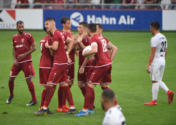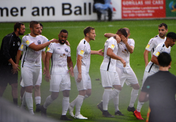 09.08.2019 hn Air Sportpark Dreieich Hessenliga Saison 2019/2020 SC Hessen Dreieich gegen FC Hanau 93 Torjubel bei den Spielern von Hanau *** Foto:Peter Hartenfelser ****** Foto: Peter Hartenfelser