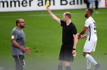09.08.2019 hn Air Sportpark Dreieich Hessenliga Saison 2019/2020 SC Hessen Dreieich gegen FC Hanau 93 gelb Karte für Giovanni Fallacara (Abteilungsleiter Hanau) von Schiedsrichter Johannes Frohnapfel *** Foto:Peter Hartenfelser ****** Foto: Peter Hartenfelser