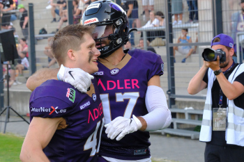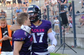 24.06.2023 xkhx Frankfurt am Main, PSD Bank Arena American Football - ELF European League of Football 2023 Frankfurt Galaxy - Paris Musketeers Reece Horn (17, Frankfurt Galaxy) und Gauthier, Sebastian (41, Frankfurt Galaxy)