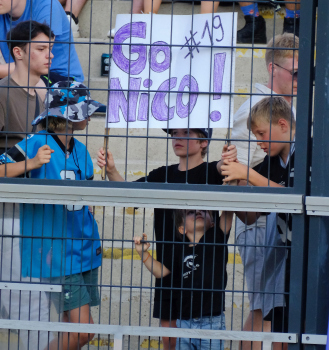 24.06.2023 xkhx Frankfurt am Main, PSD Bank Arena American Football - ELF European League of Football 2023 Frankfurt Galaxy - Paris Musketeers diese kleinen Fans feuern Strahmann, Nico (19, Frankfurt Galaxy) an