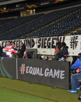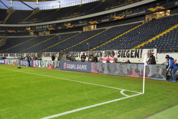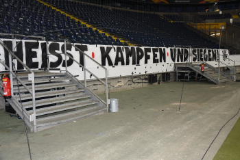 Leere Ränge, leere Sitzplätze, Leere, Keine Fans, Symbolfoto, Leeres Stadion, aber Spruchband der Ultras