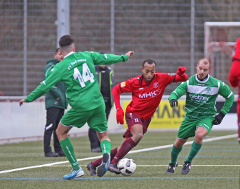 10.02.2018, xxx Fussball, Testspiel 2018, SC Hessen Dreieich Hessenliga - FV Bad Vilbel Verbandsliga Sued; v.l: Adnan Alik (FV Bad Vilbel), Carlos McCrary (SC Hessen Dreieich), Thorben Knauer (FV Bad Vilbel),