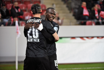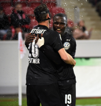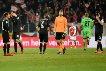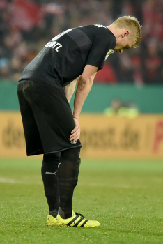 Hängende Köpfe und enttäuschte Gesichter bei Takuma Aasano (VfB Stuttgart), Marvin Kaminski (VfB Stuttgart), Emiliano Insua (VfB Stuttgart), Torwart Ron-Robert Zieler (VfB Stuttgart) und Christian Gentner (VfB Stuttgart).