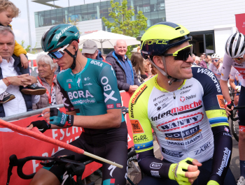 01.05.2022 xkhx Frankfurt am Main Radklassiker (Radrennen) Eschborn-Frankfurt Start - konzentriert kurz vor dem Start Profifahrer Nils Politt (GER, Bora) und Alexander Kristoff (NOR) *** Foto Peter Hartenfelser