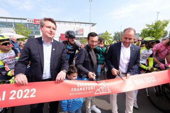 01.05.2022 xkhx Frankfurt am Main Radklassiker (Radrennen) Eschborn-Frankfurt Start - das Startband wird durchschnitten von Markus von Sternheim Stadtverordnetenvorsteher Eschborn Frankfurts Sportdezernent Mike Josef Eschborns Bürgermeister Adnan Shaikh *** Foto Peter Hartenfelser