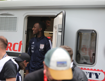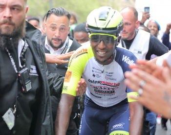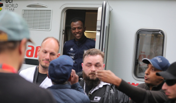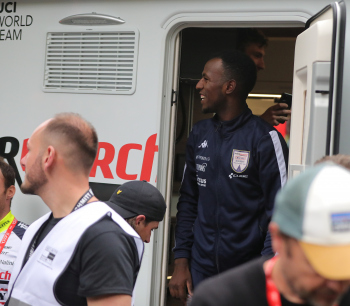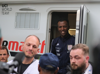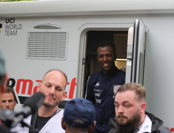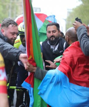 01.05.2022 xkhx Frankfurt am Main Radklassiker (Radrennen) Eschborn-Frankfurt Bergwertung Feldbarg Die eritreischen Landsleute feierten ihren ersten Profi-Rennfahrer Biniam Girmay frenetisch und endich zeigte ersich kurz in der Tür des Servicewagens *** Foto Peter Hartenfelser